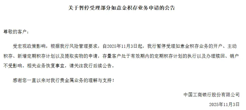 具体来看,工商银行暂停受理“如意金积存”开户、主动积存、新增定期积存计划及提取实物等申请,处于有效期内的存量定投计划继续执行,赎回与销户正常办理;恢复时间将另行公告。