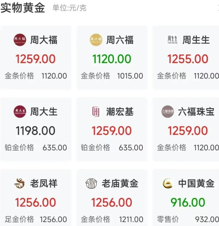 国内金饰价格普遍站上1250元/克,截至发稿,周大福、六福珠宝金饰价格报1259元/克,老庙黄金、老凤祥金饰价格报1256元/克。